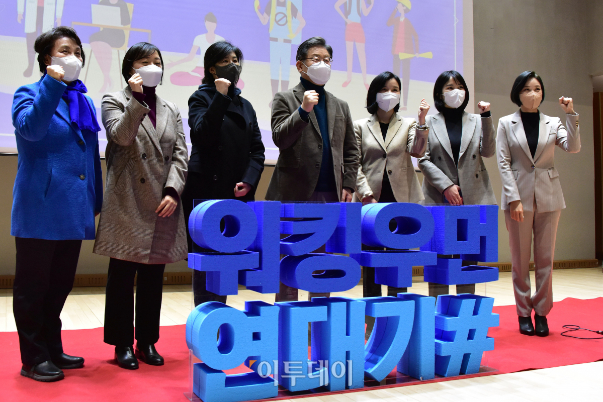 이재명 더불어민주당 대선후보가 10일 동작구 대방동 페이스살림에서 열린 ‘일하는 여성을 위한 스타트업 대표 간담회’에서 참석자들과 기념촬영을 하고 있다. 국회사진취재단