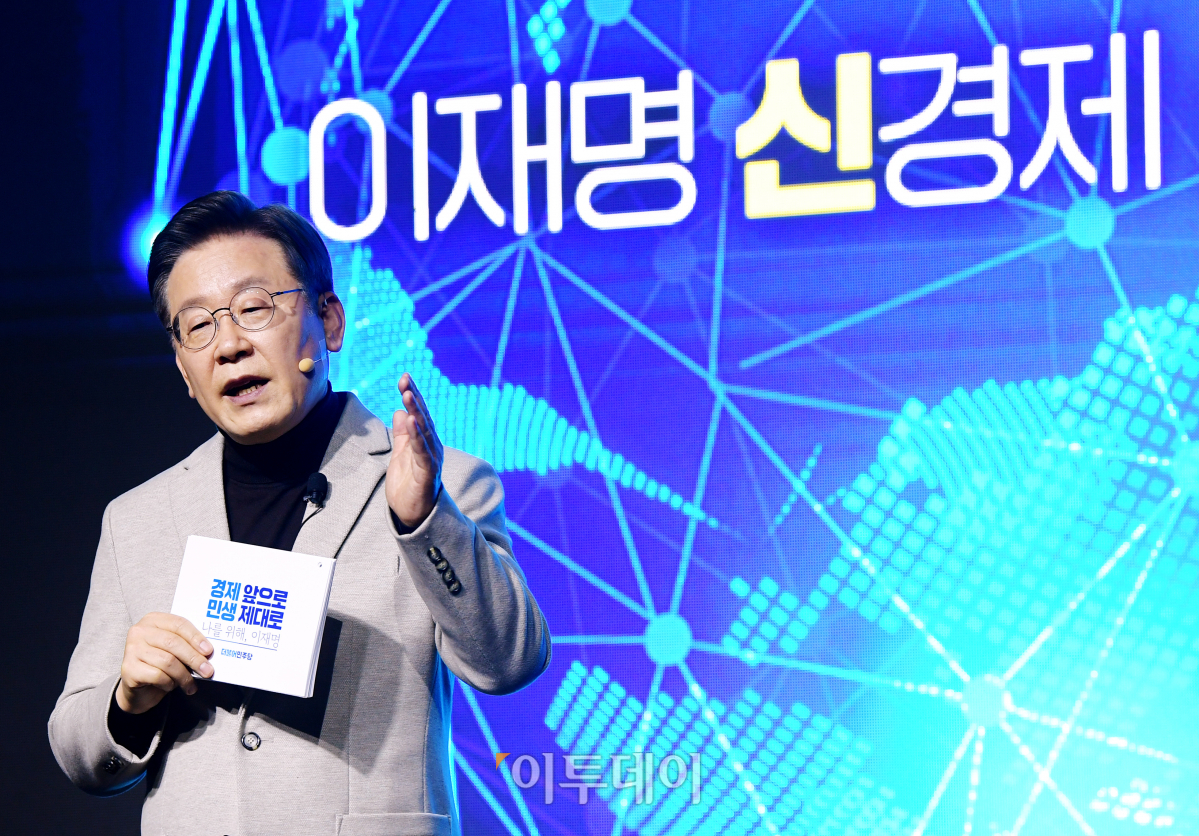 이재명 더불어민주당 후보가 11일 오전 서울 여의도 국회 의원회관 대회의실에서 열린 '신경제 비전 선포식'에서 비전발표를 하고 있다.