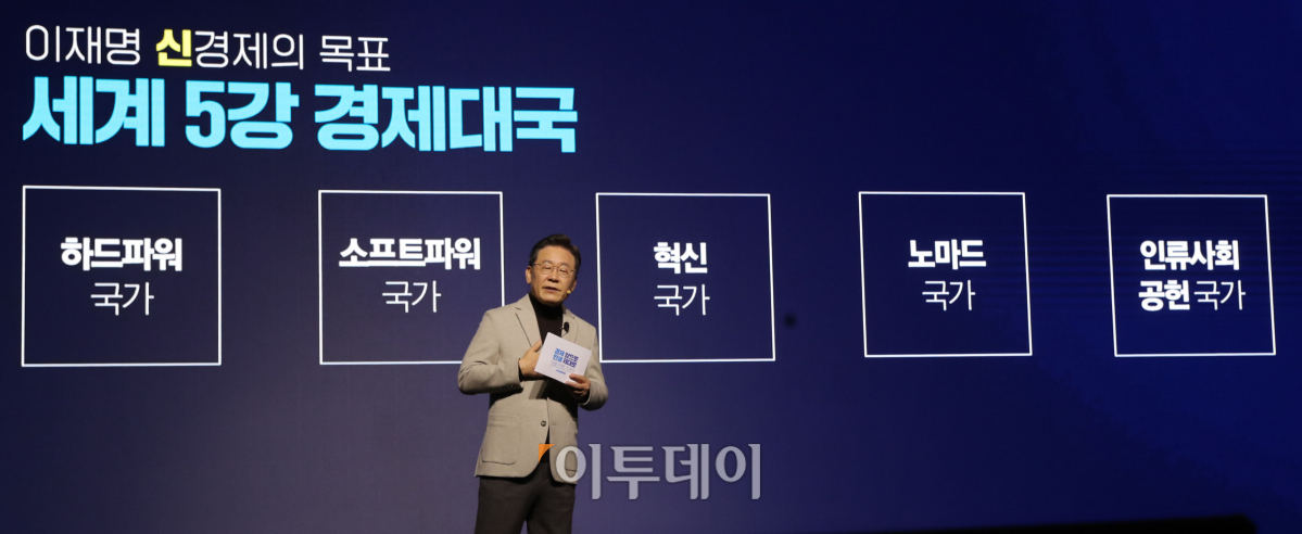 이재명 더불어민주당 후보가 11일 오전 서울 여의도 국회 의원회관 대회의실에서 열린 '신경제 비전 선포식'에서 비전발표를 하고 있다.