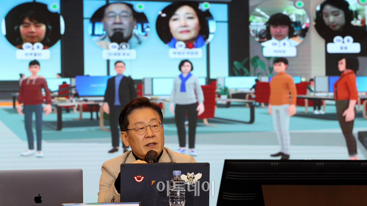이재명 더불어민주당 대선 후보가 11일 오후 서울 영등포구 여의도 중소기업중앙회관에서 ‘디지털 혁신 정책공약 1호’를 발표를 마친 뒤 메타버스(3차원 가상세계) 공간에 참석한 사람들과 인사를 나누고 있다.
