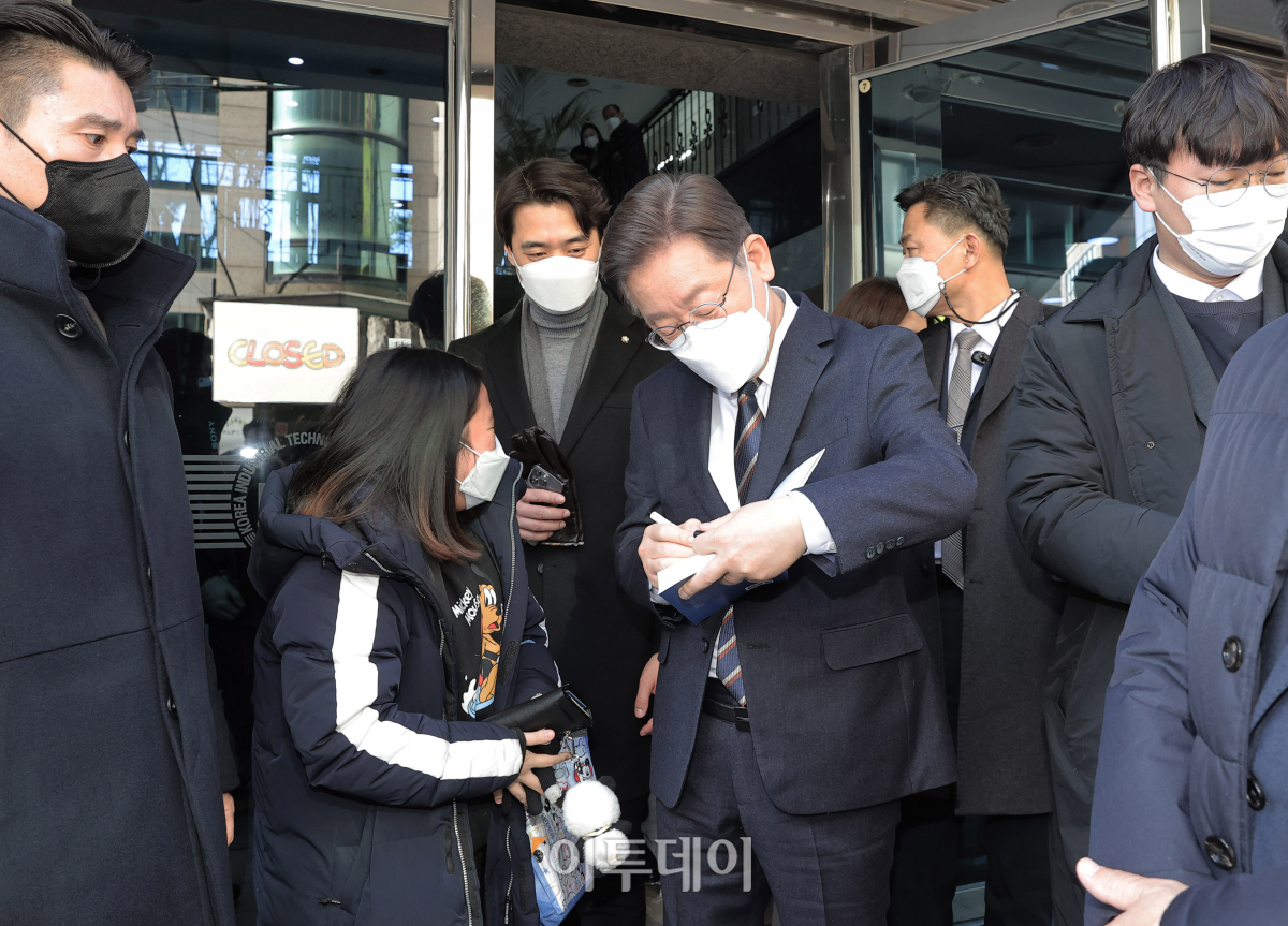 이재명 더불어민주당 대선후보가 12일 서울 서초구 한국산업기술진흥협회에서 산업 분야 정책 공약 발표를 마치고 나와 지지자에게 사인을 해주고 있다. 국회사진취재단
