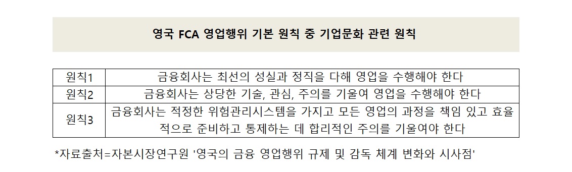 이성복 자본시장연구원 연구위원이 2015년에 발간한 ‘영국의 금융 영업행위 규제 및 감독 체계 변화와 시사점’을 보면 FCA는 11개의 기본원칙을 제시하고 영업행위의 감독과 제재 근저로 활용한다.