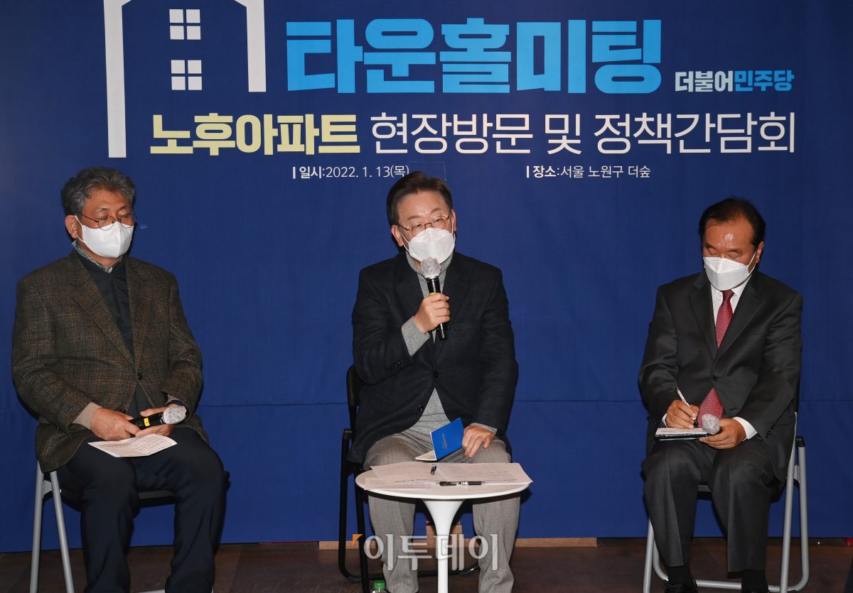 이재명(가운데) 더불어민주당 대선후보가 13일 오전 서울 노원구 더숲에서 열린 타운홀 미팅 정책간담회에서 발언하고 있다. 국회사진취재단