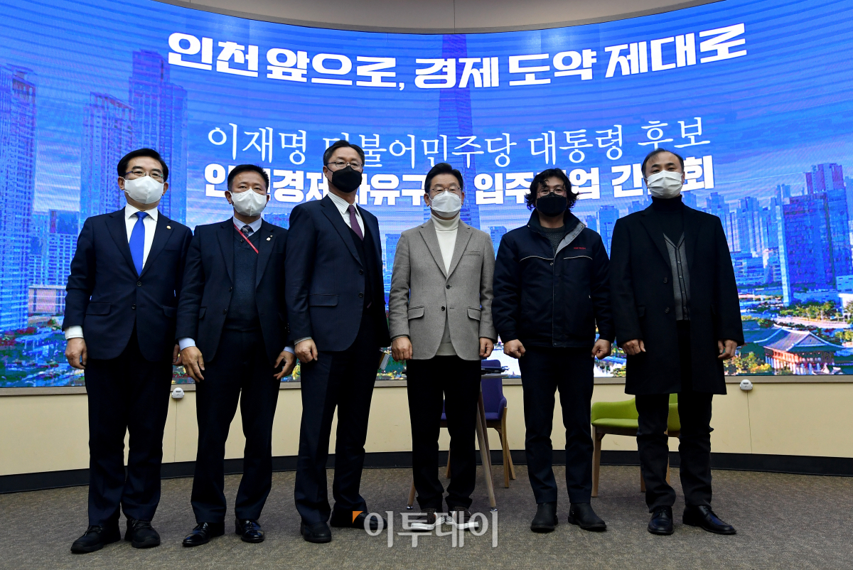 이재명 더불어민주당 대선후보가 14일 오전 인천 연수구 인천경제자유구역청에서 열린 인천경제자유구역 입주기업 간담회에서 입주기업 대표들과 기념촬영을 하고 있다. 국회사진취재단