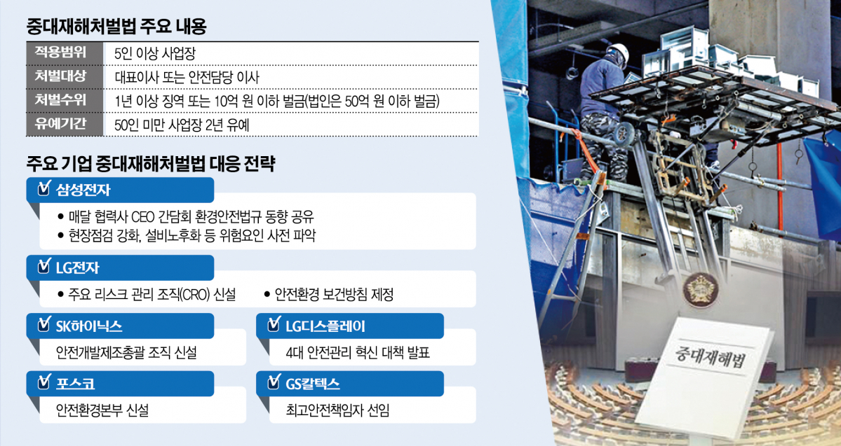 산업계가 ‘중대재해처벌에 관한 법률’(중대재해 처벌법)의 커다란 산을 마주했다. 가뜩이나 경영 불확실성이 커진 상황에서 기준이 모호한 규제가 또 늘어나면서 부담이 가중되고 있다. 산업계는 제도 시행 초기 혼란을 최소화하기 위해 안전 관련 전담팀을 신설하거나 기존 조직을 확대하는 등 다각적인 노력을 기울이고 있다. 27일 법 적용 후 ‘첫 본보기’가 되지 않기 위해 안간힘을 쓰는 모습이다.