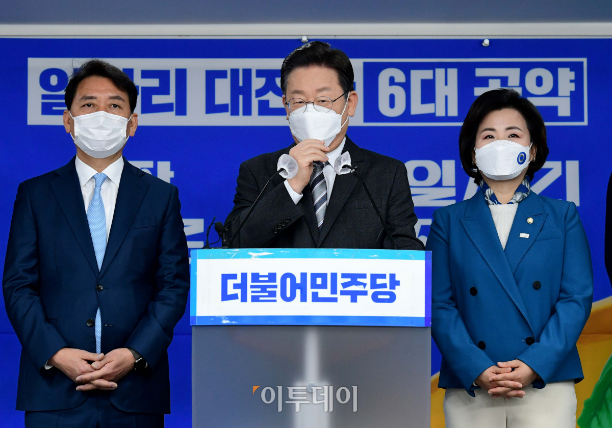 이재명이재명 더불어민주당 대선후보가 18일 서울 여의도 민주당사에서 일자리 대전환 6대 공약을 발표한 뒤 취재진의 질의를 듣고 있다.