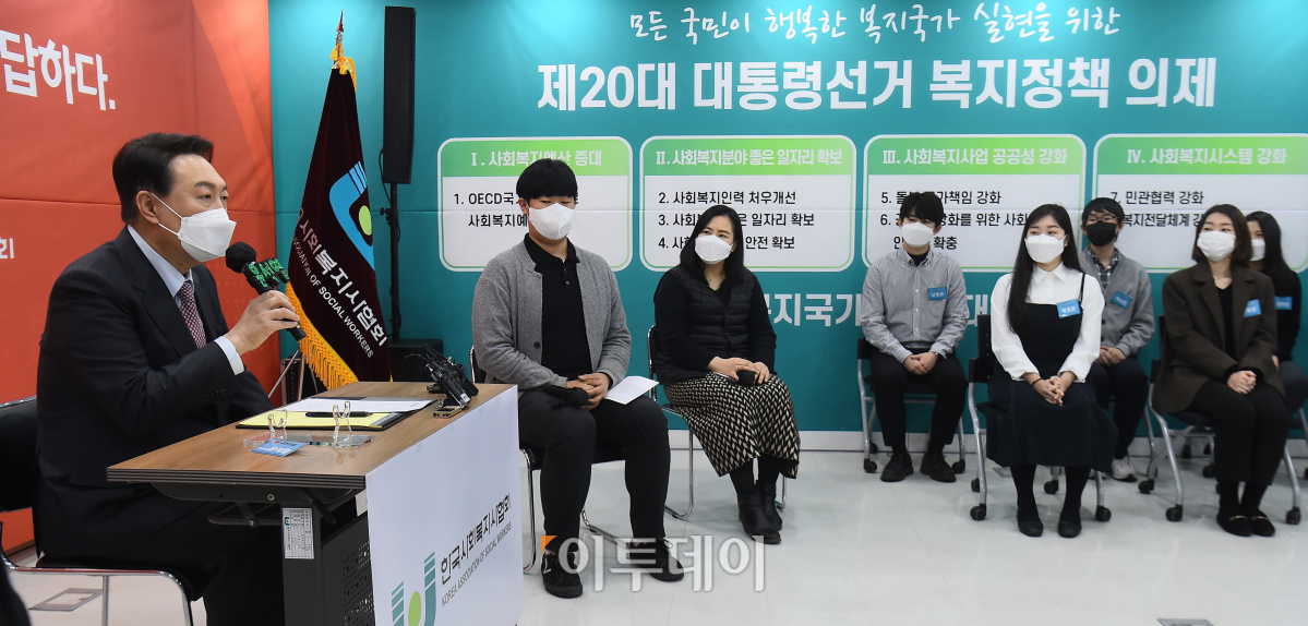 국민의힘 윤석열 대선후보가 18일 서울 영등포구 사회복지사협회에서 간담회를 갖고 사회복지사 처우 개선 등에 대한 견해를 밝히고 있다. 국회사진취재단