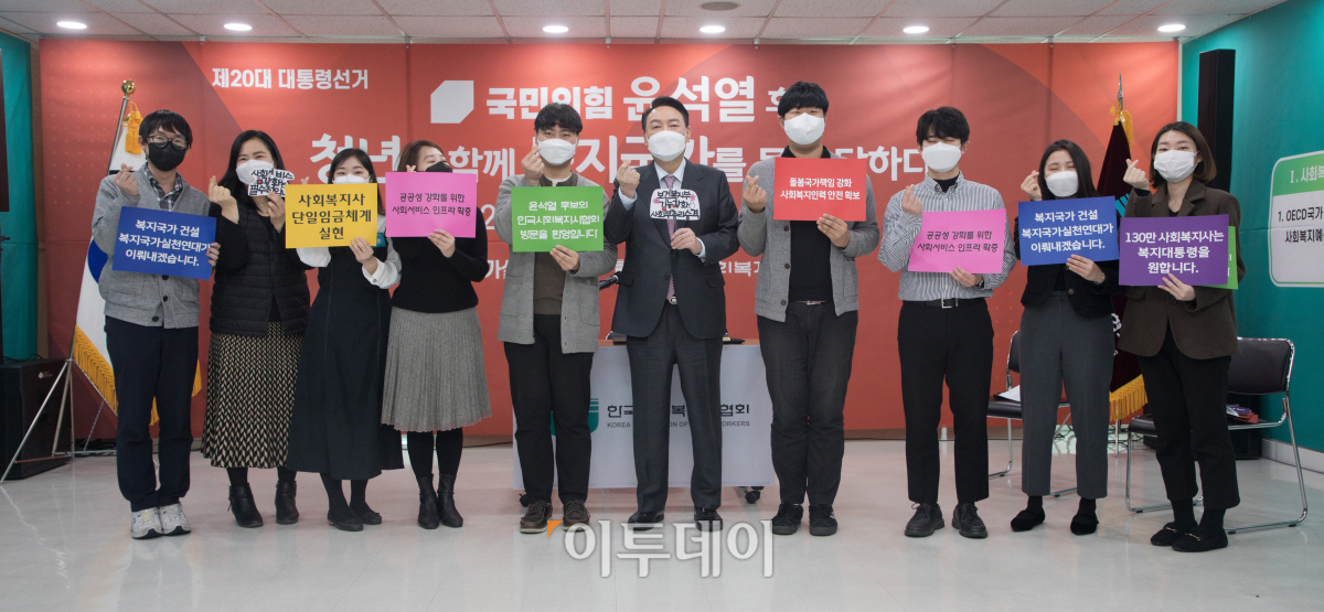 18일 오전 국민의힘 윤석열 후보가 서울 문래동에 위치한 사회복지사협회를 방문해 질의응답을 한 청년사회복지사들과 기념촬영을 하고 있다. 국회사진취재단