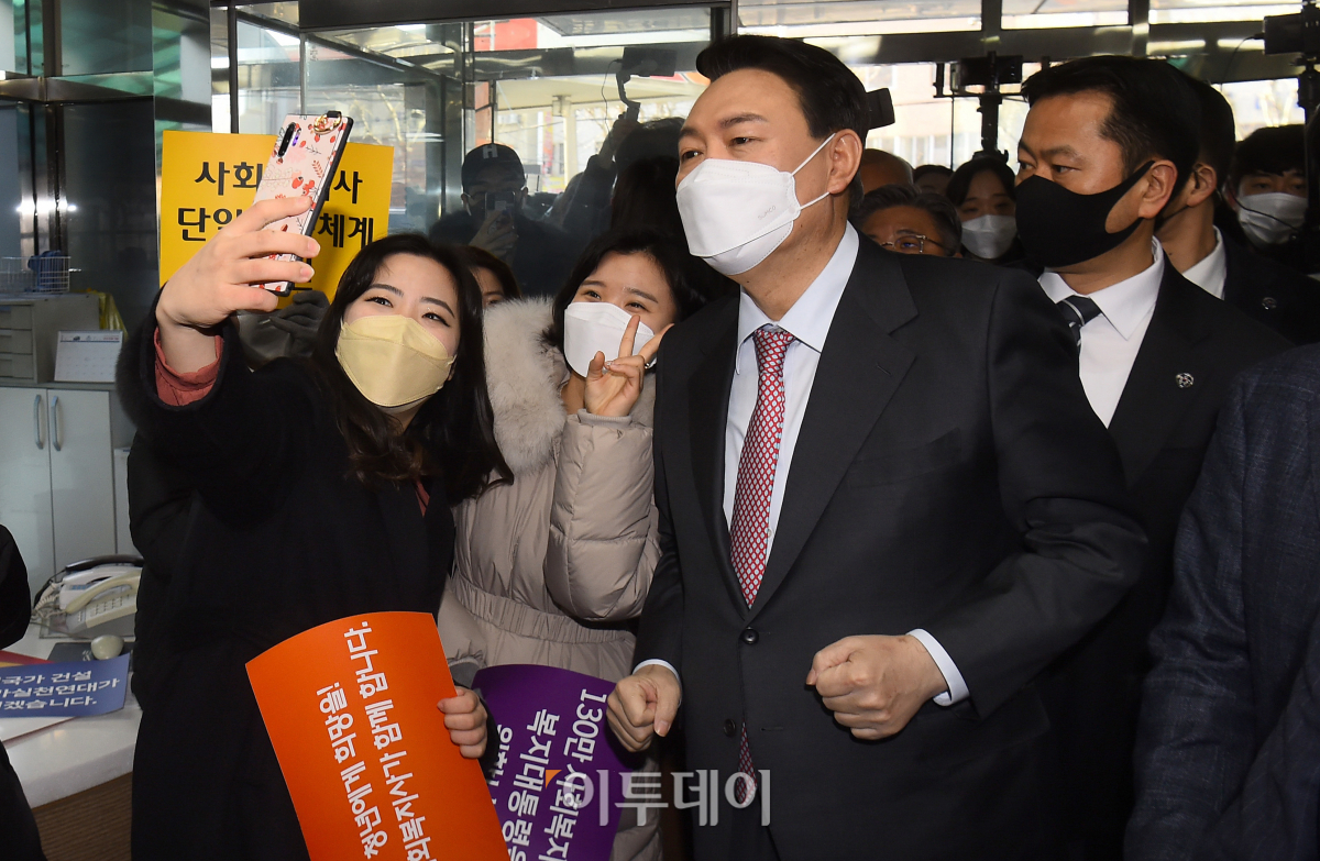 국민의힘 윤석열 대선후보가 18일 서울 영등포구 사회복지사협회에서 간담회를 갖기 전 관계자들과 인사를 나누고 있다. 국회사진취재단