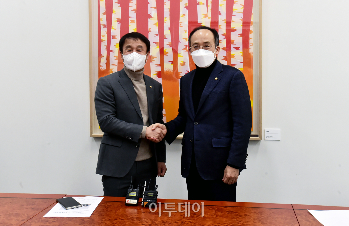 한병도 더불어민주당 원내수석부대표(왼쪽)와 추경호 국민의힘 원내수석부대표가 18일 서울 여의도 국회 본관 241호에서 회동을 하고 있다. 이날 여야 원내수석부대표 회동은 비공개로 진행됐다.