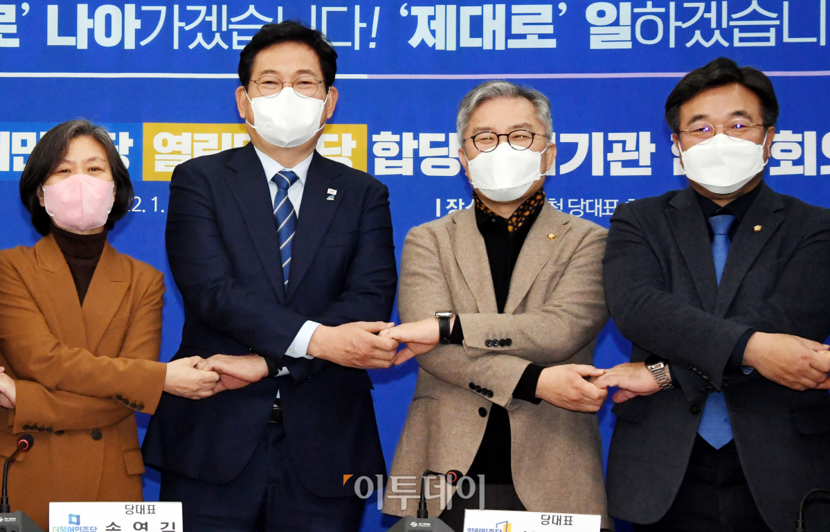 18일 오후 국회에서 더불어민주당-열린민주당 합당수임기관 합동회의전 손을 맞잡고 있다. 좌측부터 강민정 송영길 최강욱 윤호중.