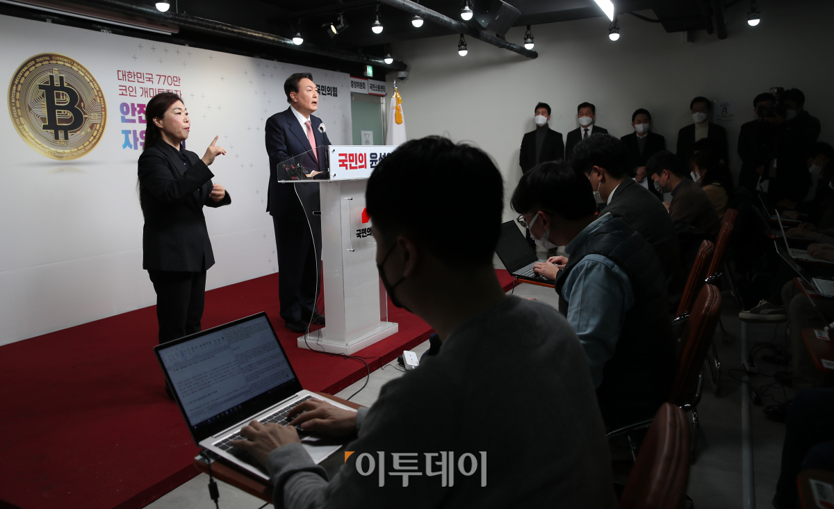 윤석열 국민의힘 대선 후보가 19일 오전 서울 여의도 당사에서 가상자산 개미투자자 안심투자 정책 공약을 발표하고 있다.