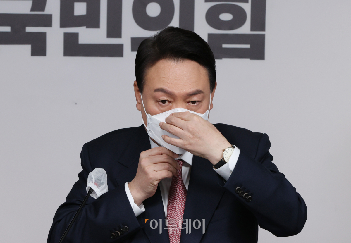 윤석열 국민의힘 대선 후보가 19일 오전 서울 여의도 중앙당사에서 장애인 관련 정책공약을 발표를 마친 뒤 마스크를 쓰고 있다.