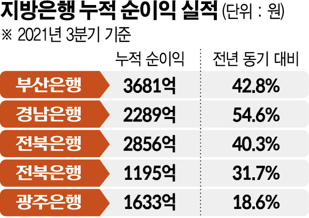 BNK부산은행의 3분기 누적 순이익은 3681억 원으로, 지난해 같은 기간보다 42.8% 증가했다. 같은 기간 BNK경남은행이 54.6% 증가한 2289억 원의 순이익을 달성했으며, 전북은행은 31.7% 증가한 1195억 원, 광주은행은 18.6% 늘어난 1633억 원의 순이익을 기록했다. 대구은행은 순이익이 무려 40.3%나 증가한 2856억 원에 달했다.