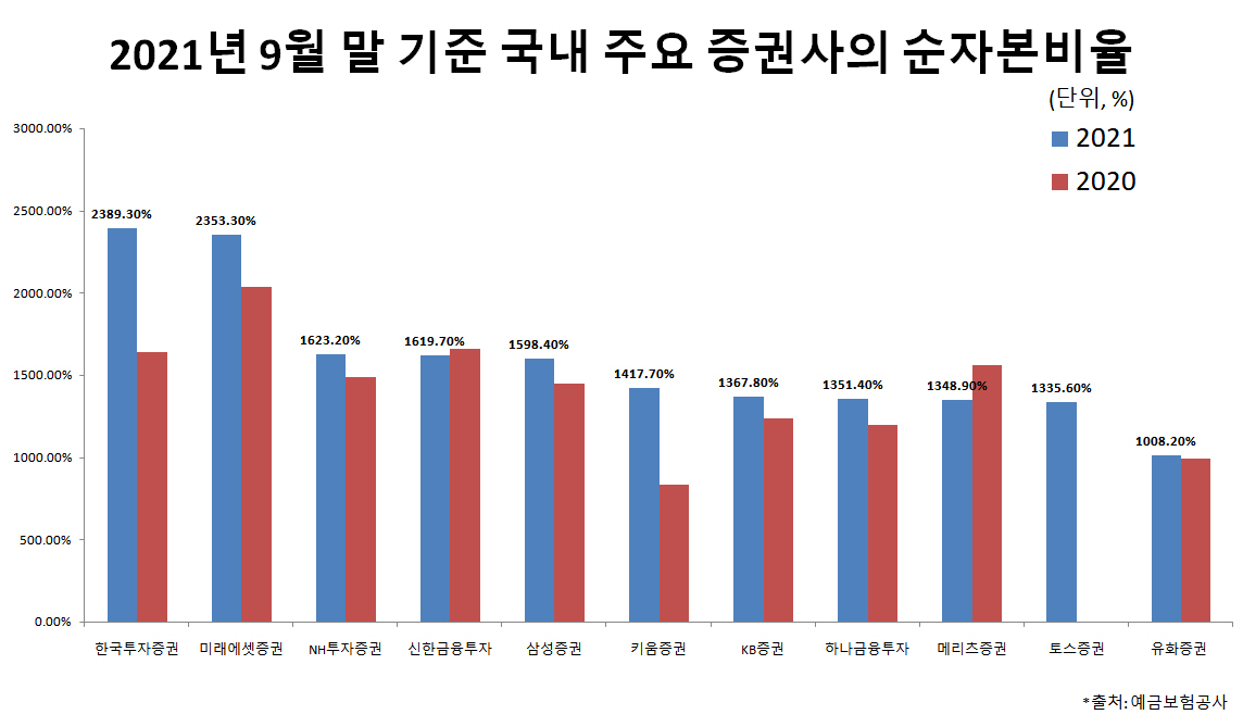 현황을 보면 2021년 9월 말 기준 국내 증권사 중 한국투자증권의 순자본비율은 2389.3%로 가장 높게 집계됐다. 이 밖에 △미래에셋증권(2353.3%) △NH투자증권(1623.2%) △신한금융투자(1619.7%) △삼성증권(1598.4%) △키움증권(1417.7%) △KB증권(1367.8%) △하나금융투자(1351.4%) △메리츠증권(1348.9%) △토스증권(1335.6%) △유화증권(1008.2%) 등도 순자본비율이 1000% 이상으로 나타났다.