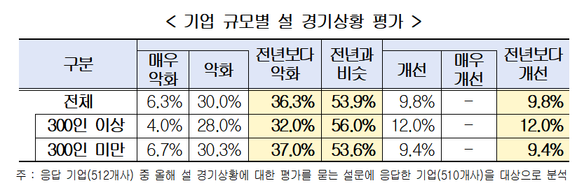 이번 조사에서 응답 기업 중 53.9%는 올해 설 경기 상황이 ‘전년과 비슷한 수준’이라고 했다. '경기가 악화했다'는 응답도 36.3%로 집계돼 90.2%가 비슷하거나 악화한 것으로 인식했다. '경기가 개선됐다'는 응답은 9.8% 수준이었다.