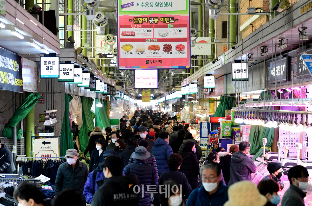 설 명절을 일주일여 앞둔 23일 서울 마포구 망원시장이 제수용품을 준비하려는 시민들로 붐비고 있다. 한국농수산식품유통공사가 설을 앞두고 전국 17개 전통시장과 27개 대형유통업체의 설 성수품 가격을 조사한 결과, 전통시장의 설 차례상 차림비용은 26만5552원으로 조사됐다고 밝혔다. 이는 지난해(26만4874원)와 비슷한 수준이다.