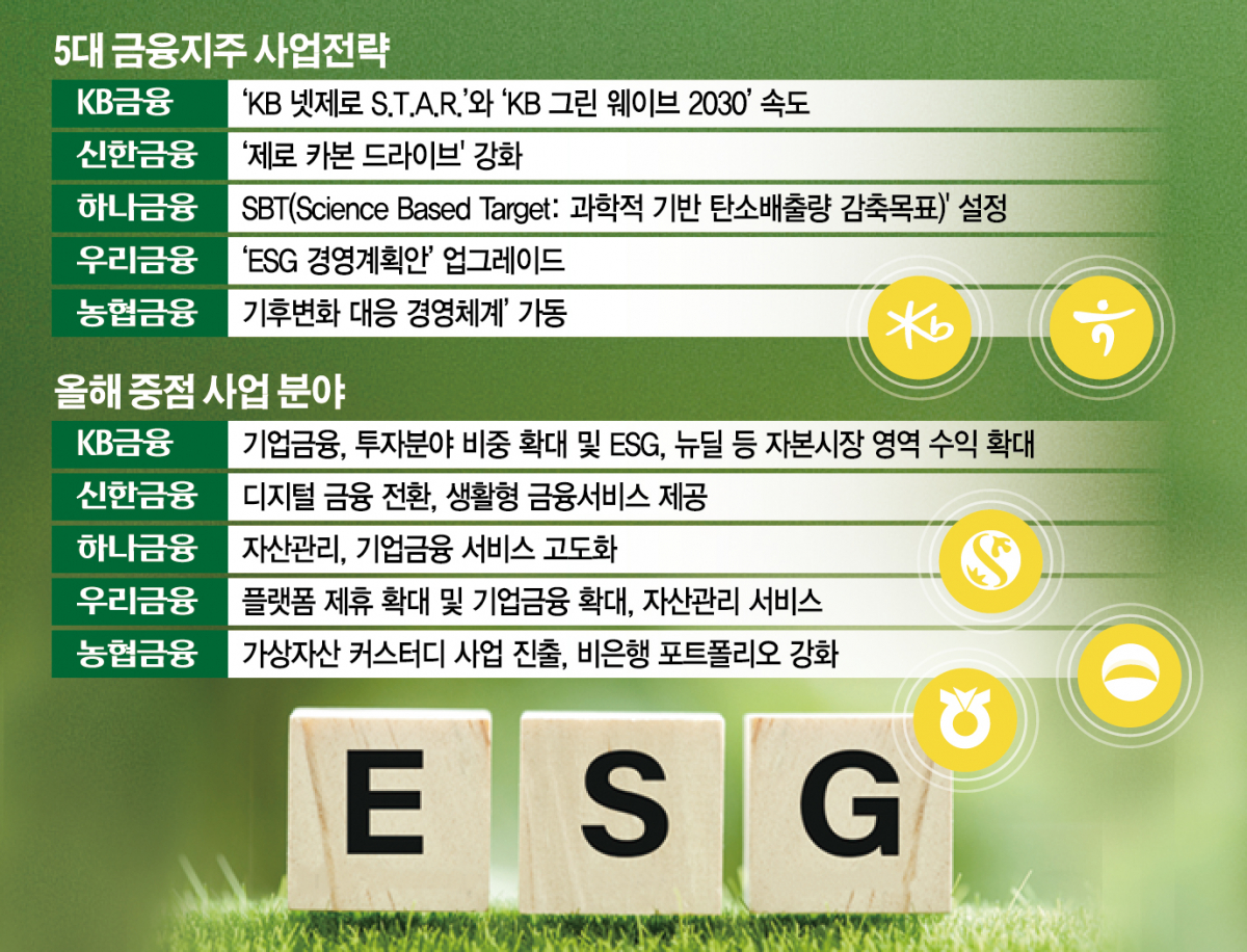 정부의 '넷제로' 목표(Net-zero, 탄소순배출량 0을 달성하는 것)에 따라 올해 금융지주 최고경영자(CEO)들이 최대 과제 중 하나로 ESG(환경·사회·지배구조)를 꼽았다. 지난해가 ESG경영 원년이었다면 2년 차인 올해는 ESG경영의 내실 있는 고도화를 위해 구체적인 계획을 수립하고 실천하겠다는 각오다.