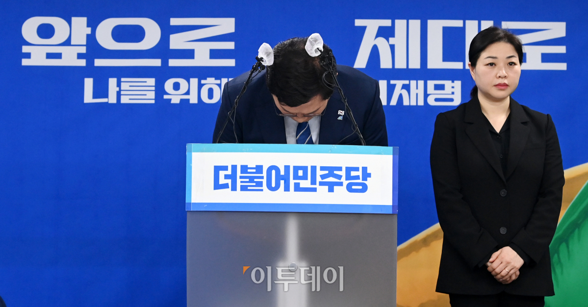 송영길 더불어민주당 대표가 25일 오전 서울 여의도 민주당사에서 열린 긴급 기자회견에 앞서 고개 숙여 인사를 하고 있다.