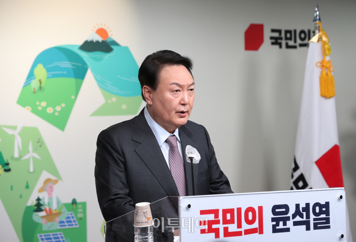 윤석열 국민의힘 대통령 후보가 25일 오전 서울 여의도 당사에서 “공기는 맑게, 쓰레기는 적게, 농촌은 잘살게”란 캐치프레이즈(표어)를 내세우며 환경과 농업 관련 공약을 발표하고 있다.