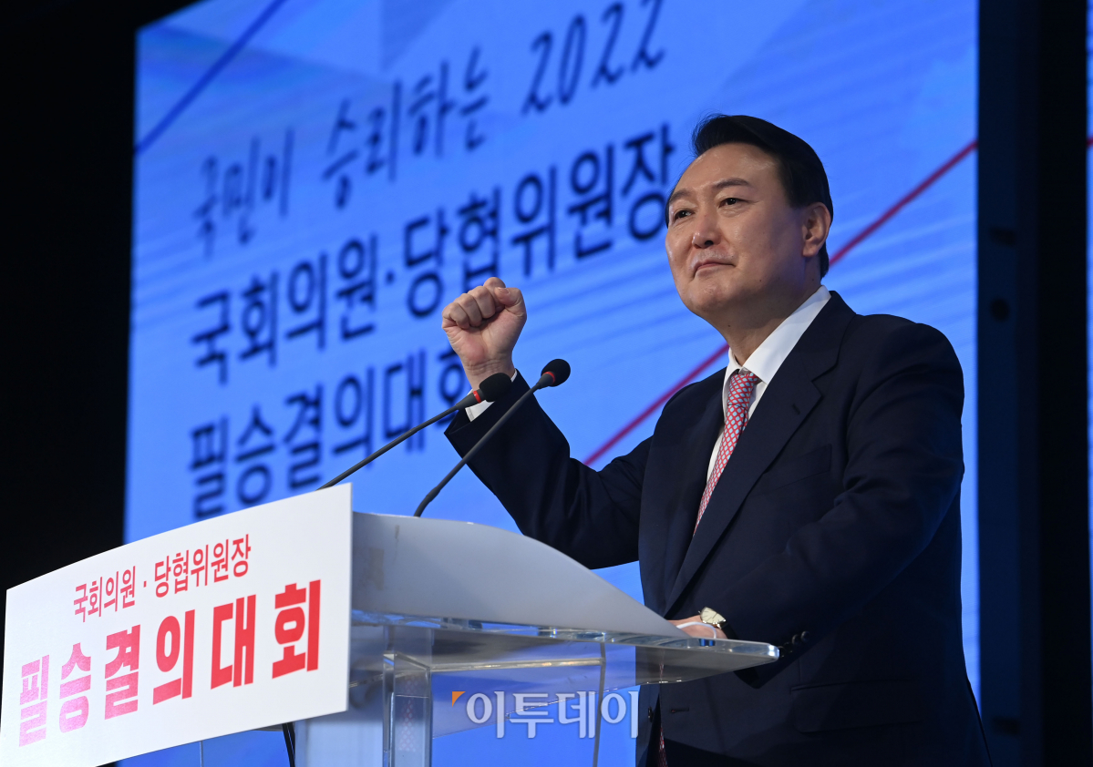 국민의힘 윤석열 대선 후보가 26일 서울 여의도 중소기업중앙회에서 열린 "우리가 윤석열이다!" 국회의원 및 원외당협위원장 필승결의대회에서 모두발언을 하며 주먹을 불끈 쥐고 있다.