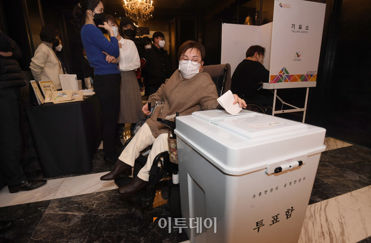 중앙선거관리위원회 주최로 26일 오후 서울 여의도 켄싱턴 호텔에서 열린 2022년 양대선거 장애인유권자 참정권 보장을 위한 정책간담회에서 참석자들이 모의투표 체험을 하고 있다.