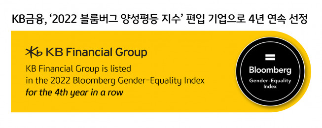 KB금융그룹이 글로벌 금융정보기관 블룸버그에서 발표한 ‘2022 블룸버그 양성평등 지수(BGEI)’ 편입 기업으로 4년 연속 선정됐다고 27일 밝혔다.