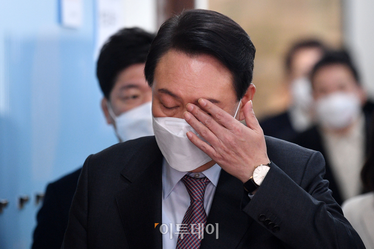 윤석열 국민의힘 대선 후보가 27일 오전 서울 여의도 국민의힘 중앙당사에서 정치 분야 공약에 나서며 얼굴을 만지고 있다.