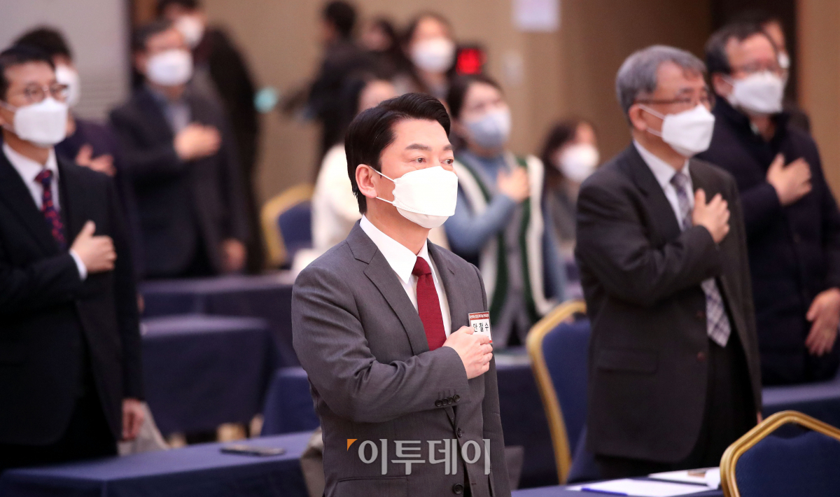 안철수 국민의당 대선후보가 27일 오후 서울 강남 한국과학기술회관 국제회의장에서 열린 대선후보 초청 과학기술 정책토론회에서 국민의례를 하고 있다. 국회사진취재단