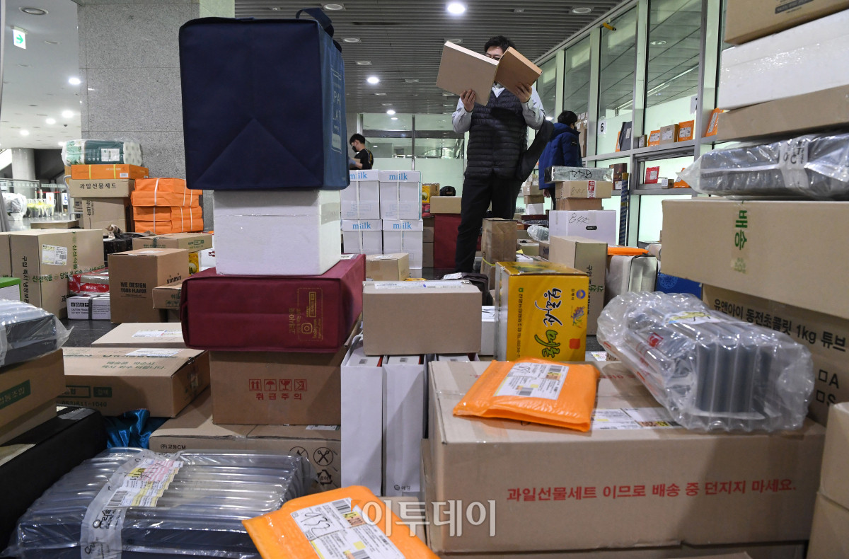 설 연휴를 앞둔 27일 서울 여의도 국회 의원회관 로비에 주인을 기다리는 명절 선물 택배상자가 수북이 쌓여 있다.