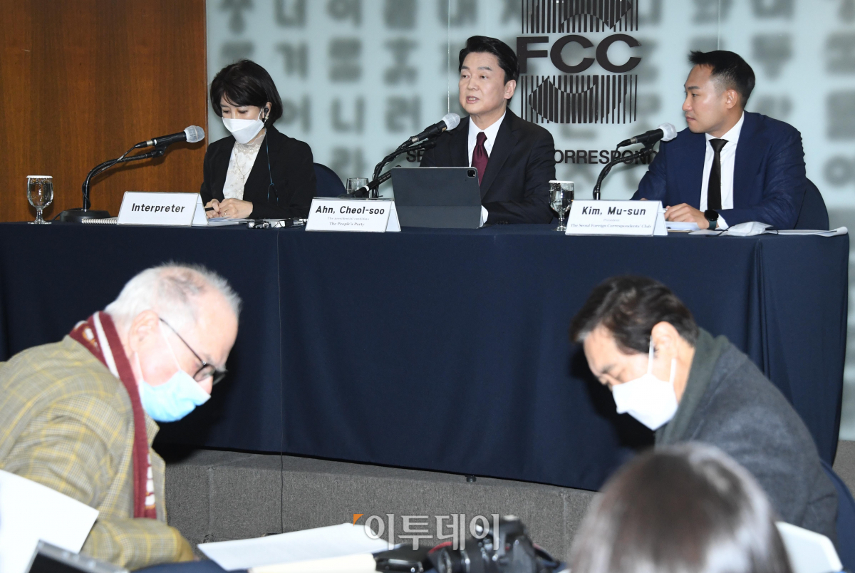 안철수 국민의당 대선후보가 28일 프레스센터에서 열린 서울외신기자클럽 초청 기자간담회에서 발언하고 있다. 국회사진취재단
