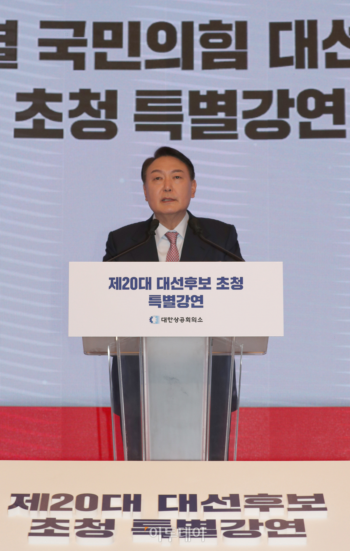 국민의힘 윤석열 대선후보가 7일 서울 중구 대한상공회의소회관 국제회의장에서 열린 대한상공회의소 초청 특별강연회에서 강연하고 있다. 국회사진취재단
