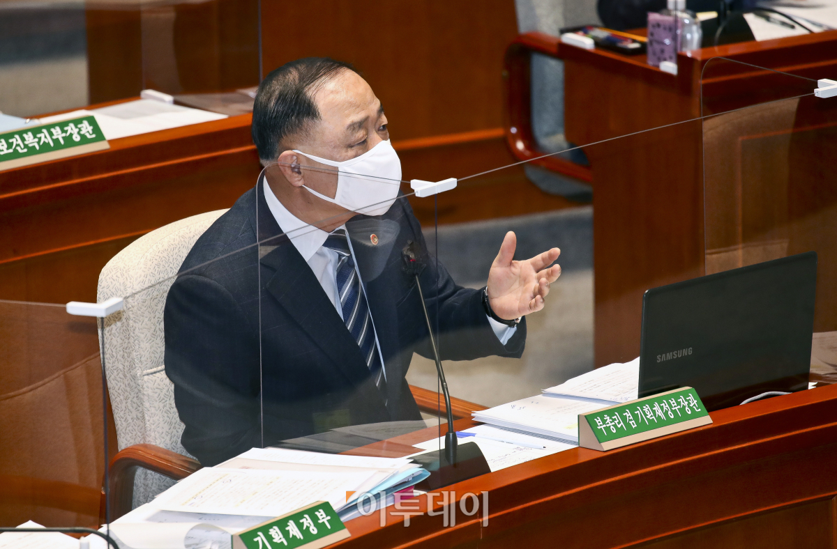 홍남기 경제부총리 겸 기획재정부 장관이 8일 오전 서울 여의도 국회에서 열린 예산결산특별위원회 전체회의에서 의원 질의에 답하고 있다.