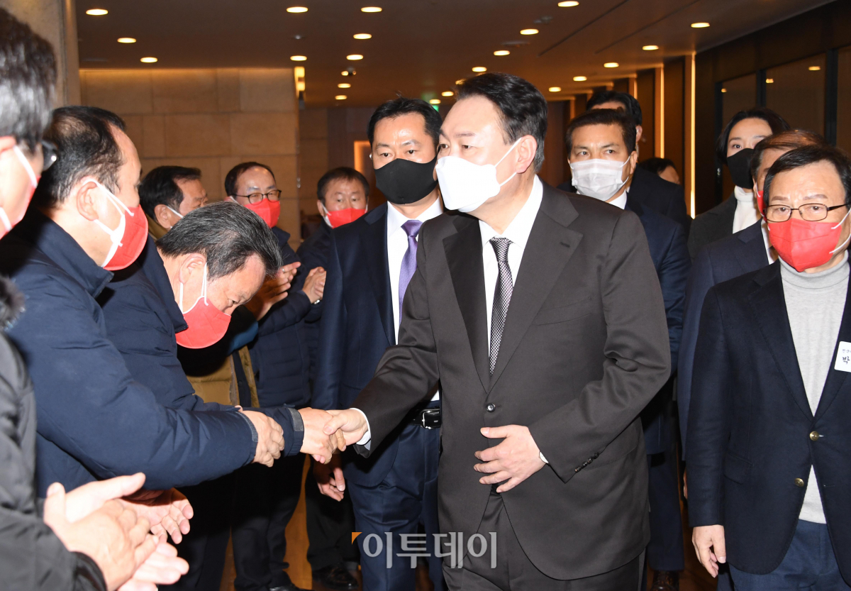 윤석열 국민의힘 대선후보가 8일 교통회관에서 열린 ‘힘내라 택시! 소통의 날’ 정책간담회에 참석해 택시업계 관계자들과 인사하고 있다. 국회사진취재단