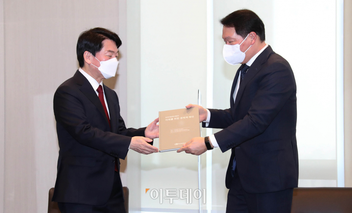 [포토] 최태원 회장에게 경제계 제언집 받는 안철수 후보