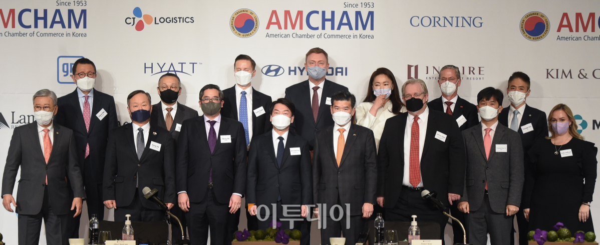 안철수 국민의당 대선 후보가 9일 오후 서울 여의도 콘래드호텔에서 열린 주한미국상공회의소(암참·AMCHAM) 초청 특별 간담회에 앞서 제임스 김 암참 회장 등 참석자들과 기념촬영을 하고 있다. 국회사진취재단