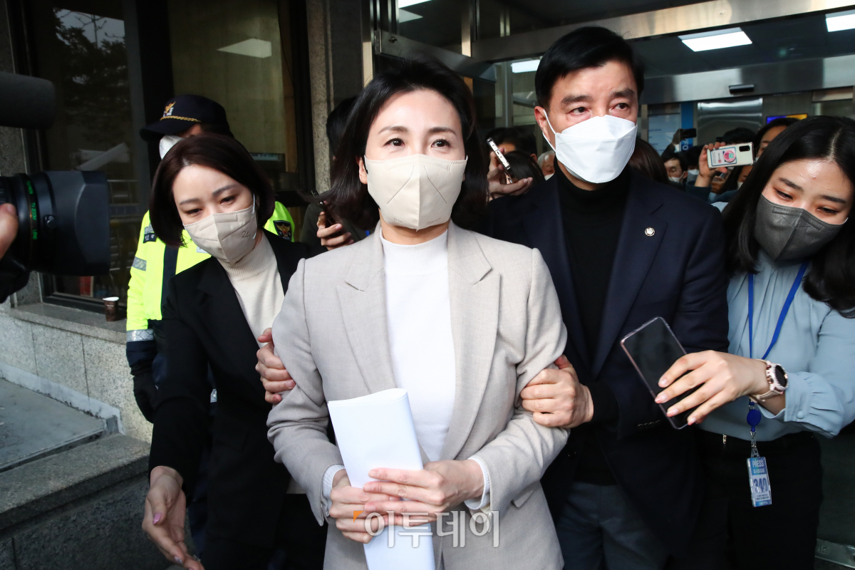 더불어민주당 이재명 대선 후보의 부인인 김혜경씨가 과잉 의전 의혹 등 논랑에 대해 9일 오후 서울 여의도 중앙당사 기자회견장에서 대국민 사과문 발표를 마친 뒤 당사를 나서고 있다.