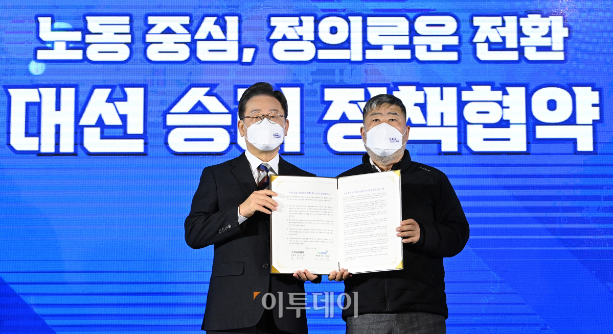 이재명 더불어민주당 대선 후보와 김동명 한국노총 위원장이 10일 오전 서울 영등포구 여의도 한국노총에서 열린 노동 정책 협약식에서 기념촬영을 하고 있다.