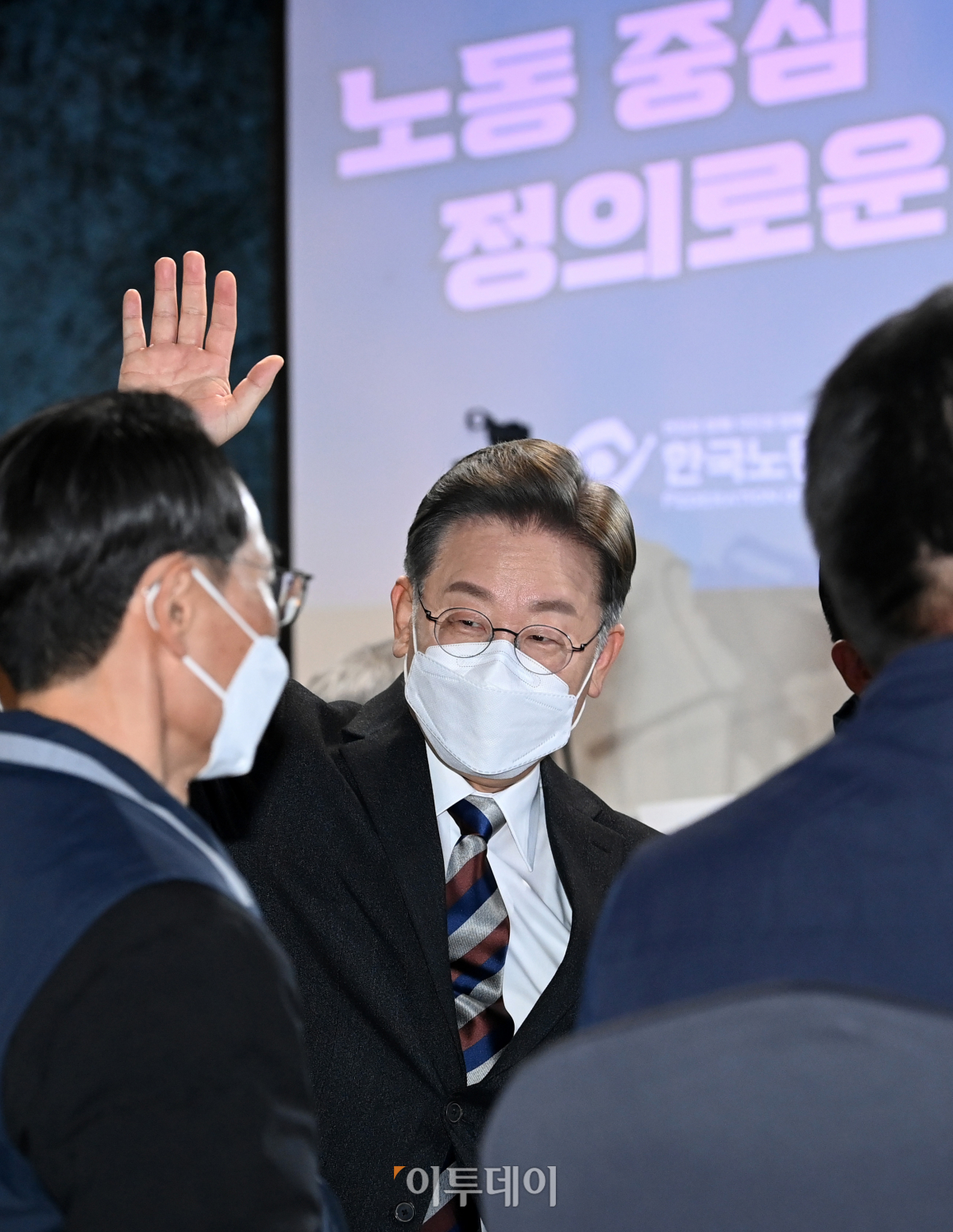 이재명 더불어민주당 대선 후보가 10일 오전 서울 영등포구 여의도 한국노총에서 열린 노동 정책 협약식에서 인사를 하고 있다.