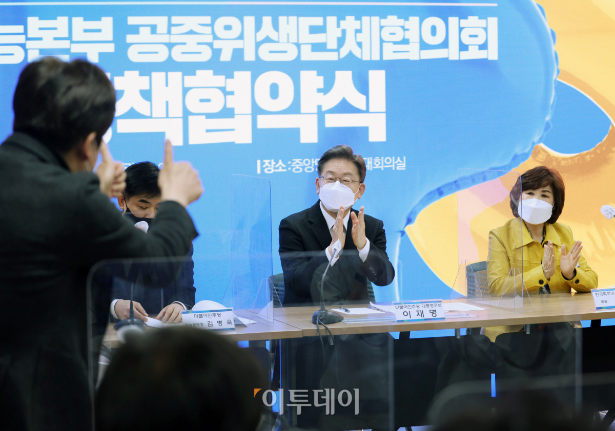 더불어민주당 이재명 대선 후보가 10일 오후 서울 여의도 중앙당사에서 열린 직능본부 공중위생단체협의회 정책협약식에서 참석자들을 소개받으며 박수를 치고 있다.