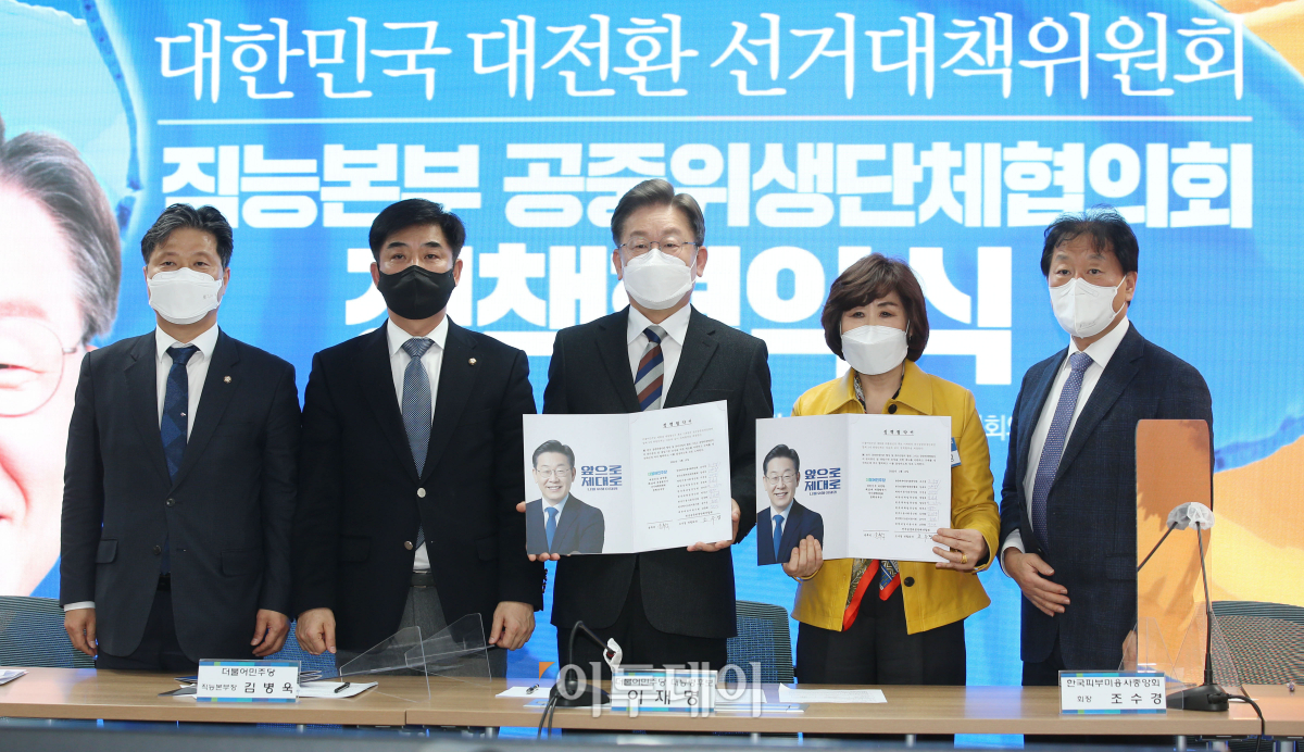 더불어민주당 이재명 대선 후보가 10일 오후 서울 여의도 중앙당사에서 열린 직능본부 공중위생단체협의회 정책협약식에서 조수경 한국피부미용사중앙회장 등과 협약서를 들고 기념촬영을 하고 있다.