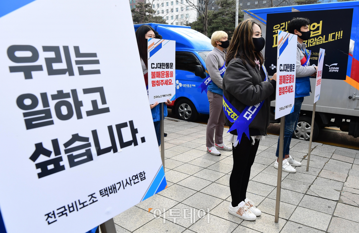 전국 비노조 택배기사연합 소속 기사들이 13일 서울 여의도 국회 앞에서 민주노총 전국택배노동조합 CJ대한통운본부의 파업 중단을 촉구하는 집회를 열고 있다.