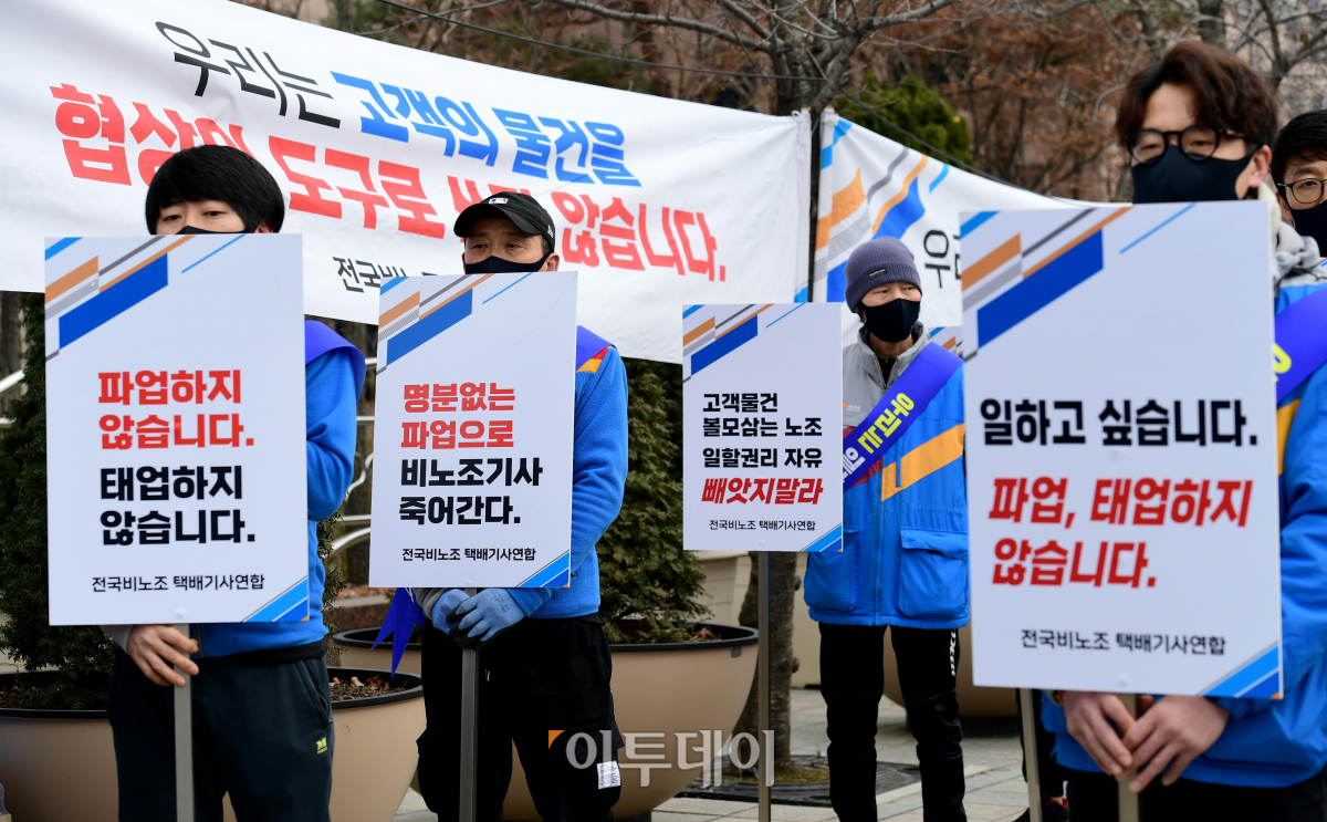 전국 비노조 택배기사연합 소속 기사들이 13일 서울 여의도 국회 앞에서 민주노총 전국택배노동조합 CJ대한통운본부의 파업 중단을 촉구하는 집회를 열고 있다.