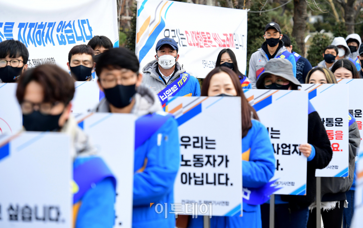 전국 비노조 택배기사연합 소속 기사들이 13일 서울 여의도 국회 앞에서 민주노총 전국택배노동조합 CJ대한통운본부의 파업 중단을 촉구하는 집회를 열고 있다.