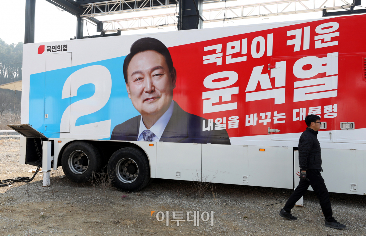 지난 11일 오후 파주에 위치한 차량광고업체에서 국민의힘 윤석열 대선후보의 선거운동 유세차량이 제작 되고 있다. 국회사진취재단