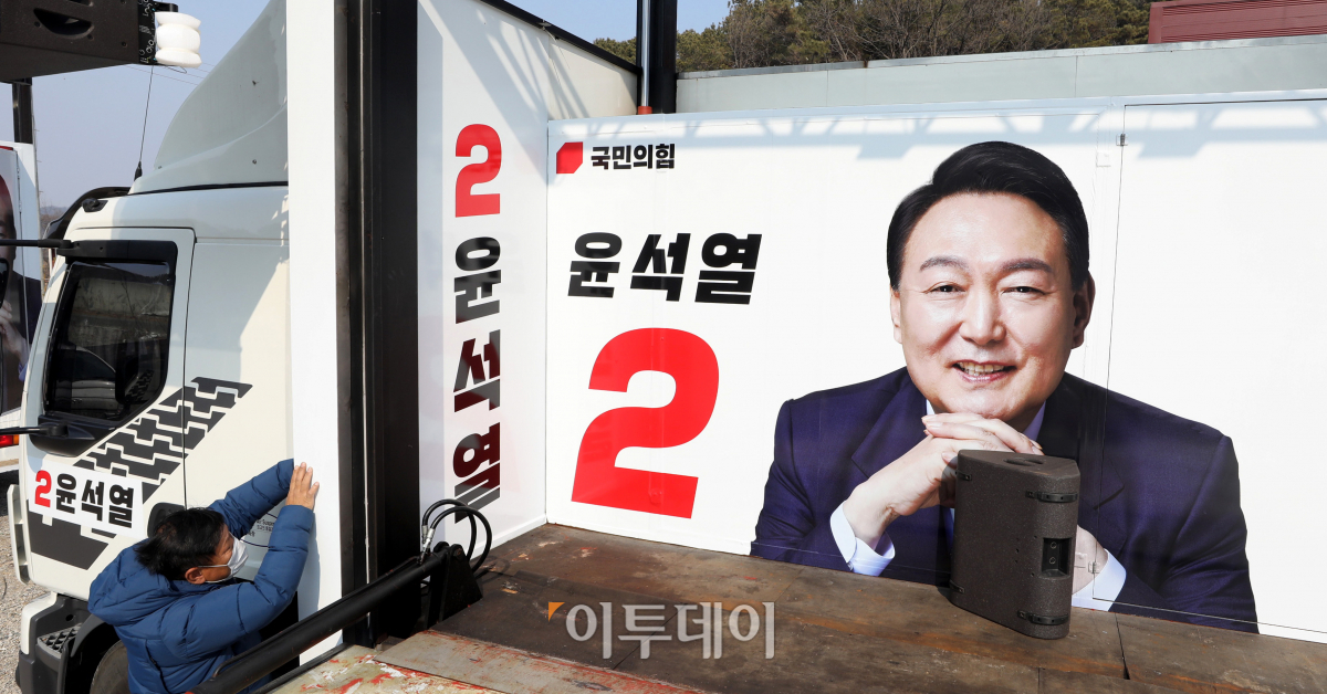 지난 11일 오후 파주에 위치한 차량광고업체에서 국민의힘 윤석열 대선후보의 선거운동 유세차량이 제작 되고 있다. 국회사진취재단