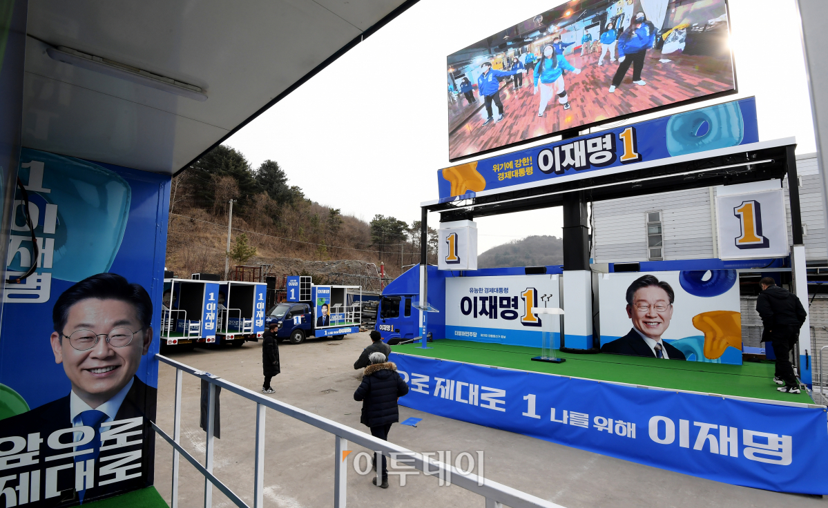 제20대 대통령선거 공식선거운동 개시일을 이틀 앞둔 13일 오후 경기도 파주시에 위치한 차량광고업체에서 관계자들이 이재명 더불어민주당 대선 후보의 선거운동 유세차량을 제작·점검하고 있다. 국회사진취재단
