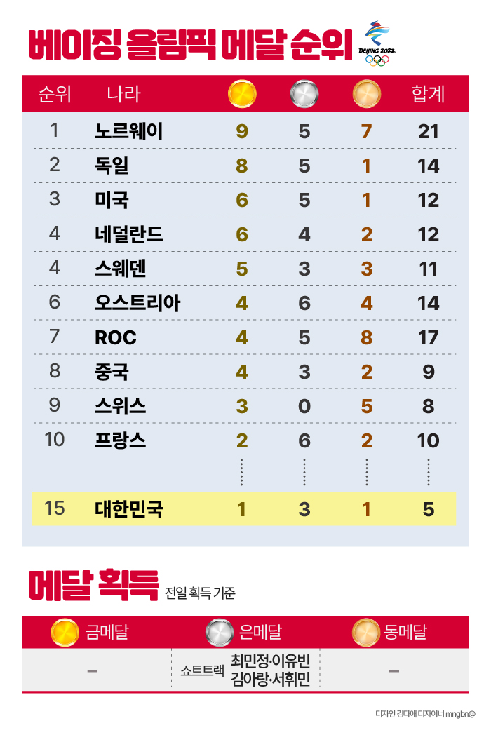 2022 베이징 동계올림픽 11일 차, 국가별 메달 순위를 보면 노르웨이가 금메달 9개, 은메달 5개, 동메달 7개로 종합순위 1위를 기록했다. 대한민국은 전날 쇼트트랙 여자 계주팀의 은메달을 추가하며 금메달 1개, 은메달 3개, 동메달 1개로 종합순위 15위에 올라있다.