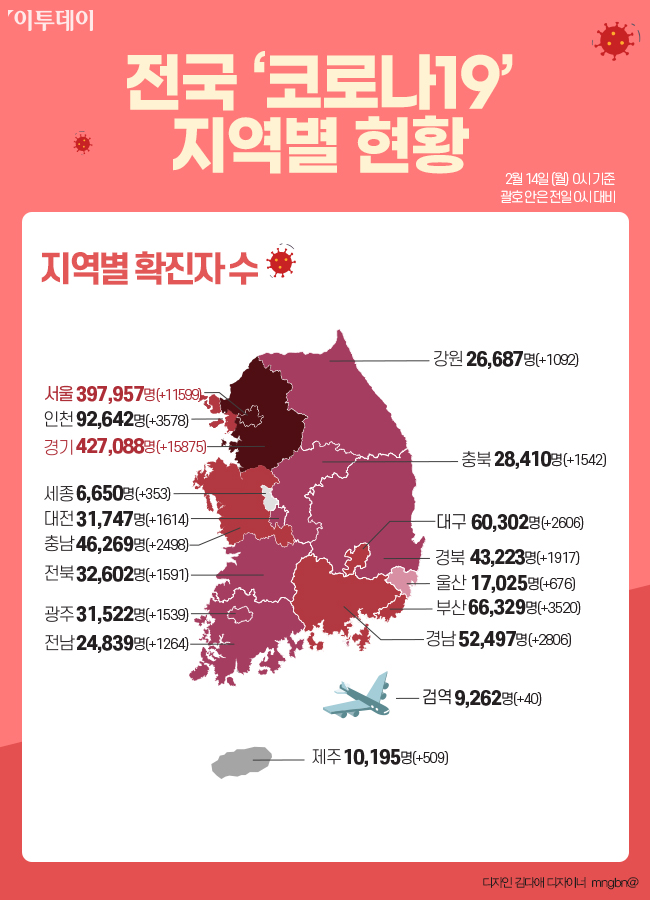 신규 확진자 5만4619명 중 1만1599명은 서울에서 발생했으며, 부산 3520명, 대구 2606명, 인천 3578명, 광주 1539명, 대전 1614명, 울산 676명, 세종 353명, 경기 1만5875명, 강원 1092명, 충북 1542명, 충남 2498명, 전북 1591명, 전남 1264명, 경북 1917명, 경남 2806명, 제주에서 509명이 각각 확진됐다. 확진자 5만4619명 중 지역발생 확진자는 5만4513명으로 집계됐다. 검역소 확진자도 40명이 추가됐다.