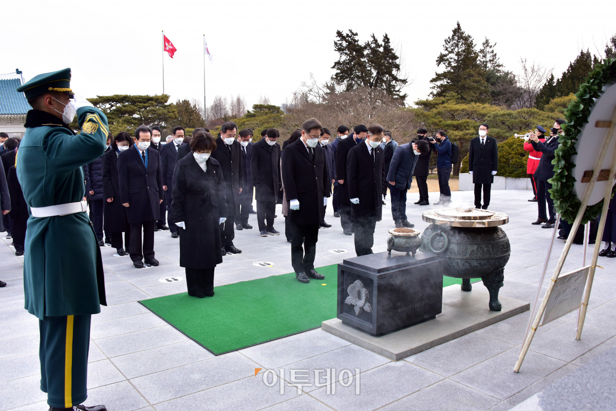 더불어민주당 이재명 대선후보와 의원들이 14일 오전 서울 동작구 국립서울현충원을 참배하고 있다. 국회사진취재단